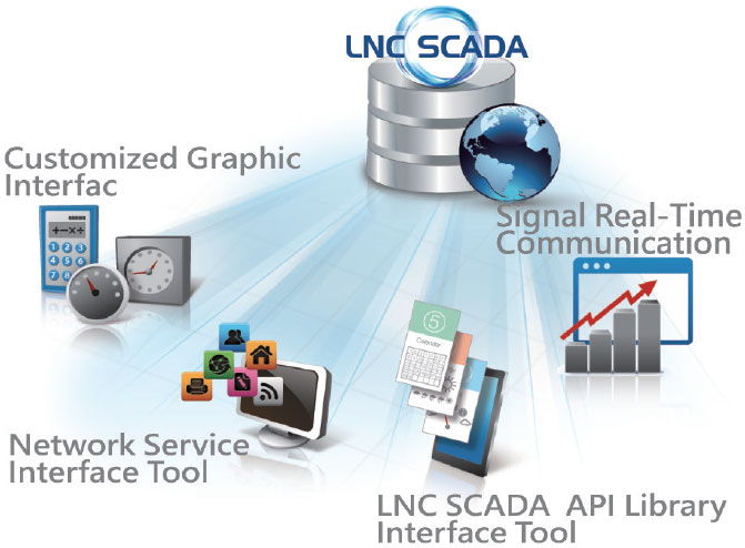 EtherCAT is becoming the mainstream industry standard 4.0, LNC in various single element numerical controls as the core, through EtherCAT interface, provides various controllers in smart factories, expansion modules, peripheral connections port of real-time monitoring. LNC SCADA is a software platform that is completely based on browsers developed by HMI/SCADA graphic controlled software and it also equips with excellent networking capability and supports rich communication protocols and drivers. Users can use LNC SCADA, a standard web browser, from anywhere to listen online and monitoring all connecting devices. Through viewing all information in the machine directly helps you diagnose the job.